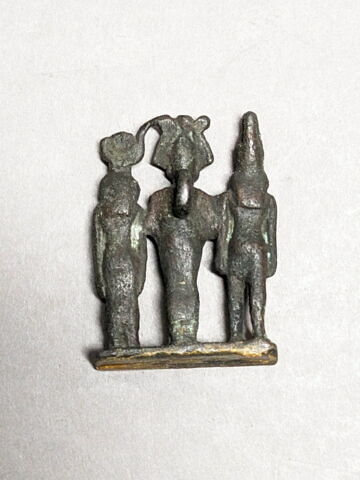 - Osiris (debout, flanqué de) ; Isis (debout, cornes disquées) ; Horus (dieu à tête de faucon, debout, couronne pschent) ; à bélière (derrière, Osiris) (réunis sur un même socle)