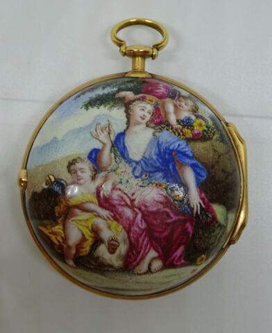 - La peinture sur émail du fond du boîtier reproduit une oeuvre de P.J. Cazes "Le Printemps" gravée par Desplaces vers 1720. Le contre-émail est orné d'un paysage, la lunette du verre est émaillé d'un paysage circulaire avec des personnages. Le cadran d'émail blanc est orné au centre, en réserve, d'un motif ciselé de losanges, en forme d'étoiles à douze pointes. Mouvement doté d'un échappement à roue de rencontre avec potence ajustable, coq repercé et gravé en forme de résille.