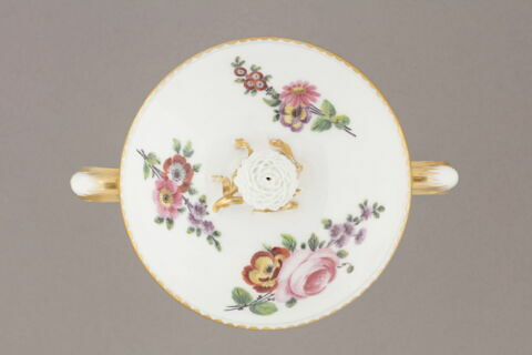 - Tasse à la reine et sa soucoupe, décor polychrome, bouquets et fleurs au naturel, rehauts d'or