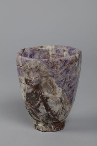 - L'améthyste utilisée aux XIVe et XVe siècles dans la fabication des vases peut être mêlée de jaspe rouge. Cette pièce comporte neuf pans alors que généralement le nombre de pans est pair sur les vases médiévaux. Bien qu'il soit épais, que sa hauteur ne soit pas constante et que les pans convexes ne soient pas tous de la même largeur, le vase est bien fait notamment les arêtes au tracé régulier. Le bord plat offre un petit biseau vers l'extérieur et un biseau plus grand vers l'intérieur. A l'intérieur, le fond du vase presque plat a gardé la trace de deux cylindres de diamètres différents, au moyen desquels la pièce a été évidée. La gorge de la partie inférieure de la panse était destinée à servir de point d'appui à une monture, c'est pourquoi la base, qui devait être cachée, n'a pas été polie. L'intérieur de la base, concave, à petit bord plat, est en revanche poli.