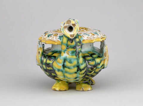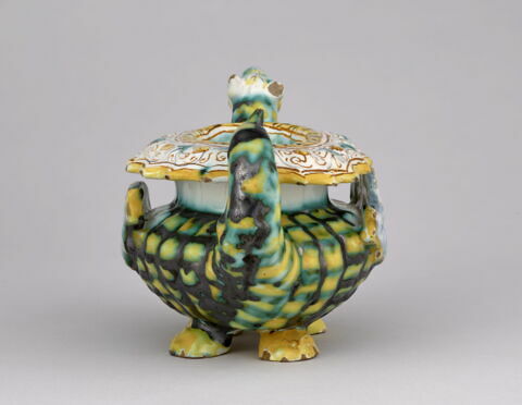 - Forme de dragon sur quatre pieds (un pied restitué) ; dans le saleron, petit putto portant un panier de fruits, entouré de rinceaux sur fond blanc.