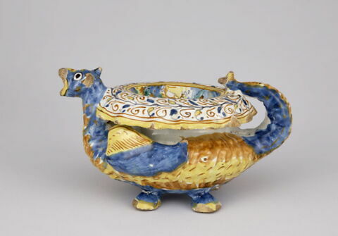 - Forme de dragon sur quatre pieds ; un petit putto dans le saleron, entouré de rinceaux sur fond blanc.
