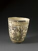 Précision sur l'objet : Boisseau à décor extérieur organisé en registres et panneaux. Le registre supérieur est orné d'une rangée de triangles et de motifs en zigzags, au-dessous apparaît une frise d'échassiers, précédant une croix en damier bloquée dans un panneau - Dimensions