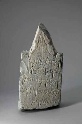 Précision sur l'objet : Stèle à fronton triangulaire entre 2 acrotères. Décor : sur le fronton, hampe d'un caducée ornée de banderoles - Inscriptions