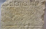 Précision sur l'objet : Stèle dédicacée à fronton triangulaire encadré d'acrotères. Décor : au fronton, avant-bras ; sur les acrotères : demi-palmette stylisée ; rangée de perles et pirouettes ; ligne droite soulignée d'un feston ; signe de Tanit entre 2 caducées - Inscriptions