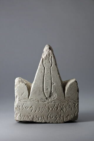 Précision sur l'objet : Stèle à fronton triangulaire haut et étroit, entre 2 acrotères. Décor : au fronton, main sur avant-bras orné de bracelets ; lignes festonnées - Inscriptions