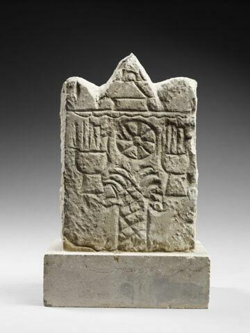 Précision sur l'objet : Stèle à fronton triangulaire entre deux acrotères et à base brisée. Ce fronton présente le signe de Tanit sur un autel aux flancs concaves. Une ligne horizontale soulignée d'un feston le sépare du registre principal. Registre principal avec rosace cerclée avec coeur et 8 pétales entre deux mains sur poignets. La partie supérieure d'un palmier est figurée en-dessous avec deux régimes de dattes stylisés. - Dimensions