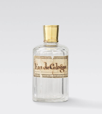 - Flacon de forme cylindrique à pans coupés. Bouchon doré
