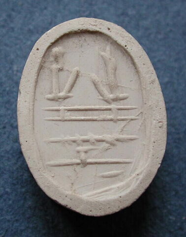 Désignation : Tirage intégral d'une empreinte d'intaille : hiéroglyphes : en haut, deux dieux affrontés ; au-dessous, les signes mer, s et hotep. (Lieu de conservation inconnu -