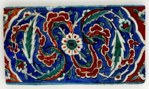 Matériau/Technique : Céramique (pâte siliceuse), décor peint sur engobe sous glaçure transparente - Date de création / fabrication