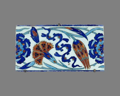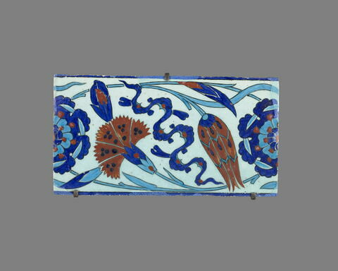 Matériau/Technique : Céramique (pâte siliceuse), décor peint sur engobe sous glaçure transparente - Date de création / fabrication