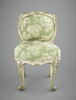 - Petite chaise en bois peint en gris. Dossier arrondi, les angles supérieurs saillants ; siège contourné ; pieds cambrés. Décor sculpté, sur le dossier, d'une coquille centrale et d'une guirlande continue de fleurs, entre des moulures ; sur le haut des pieds moulurés comme la ceinture, une couronne de fleurs traversée par deux palmes.