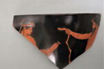 - Décor : sur vasque ; scène de conversation ; femme (restes, diadème, himation, tenant, alabastre, vers) ; homme (restes, bandeau, barbe, himation, tenant, bâton) ; à gauche ; palmette (restes)