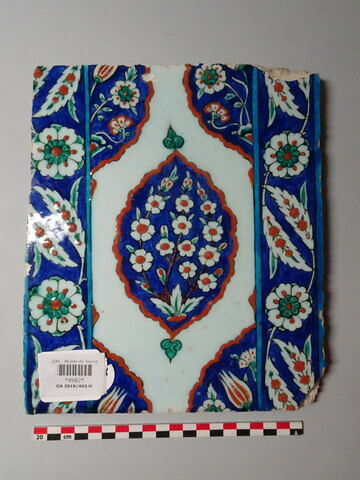 Matériau/Technique : Céramique (pâte siliceuse), décor peint sur engobe sous glaçure transparente - Date