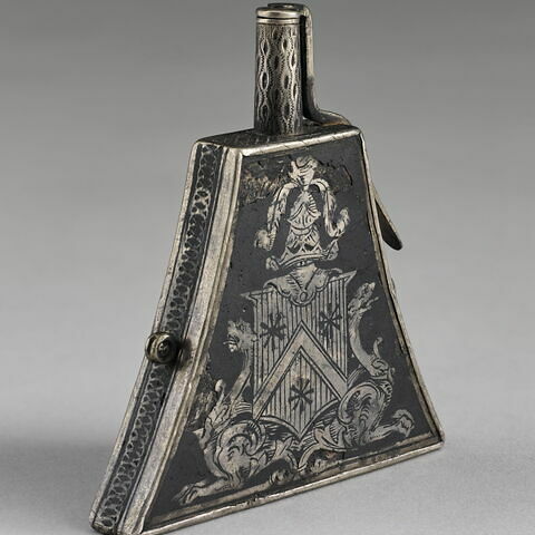 Poire à poudre aux armes d'un chevalier Epoque / période : époque moderne = Ancien Régime (Occident) Date de création/fabrication : 1600 - 1700